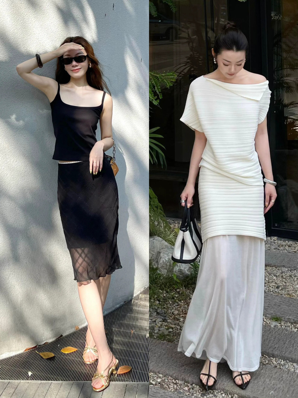 例如用黑色吊带配黑色直筒半裙,脚踩一双粗跟凉鞋,轻松勾勒出清甜的少女感。