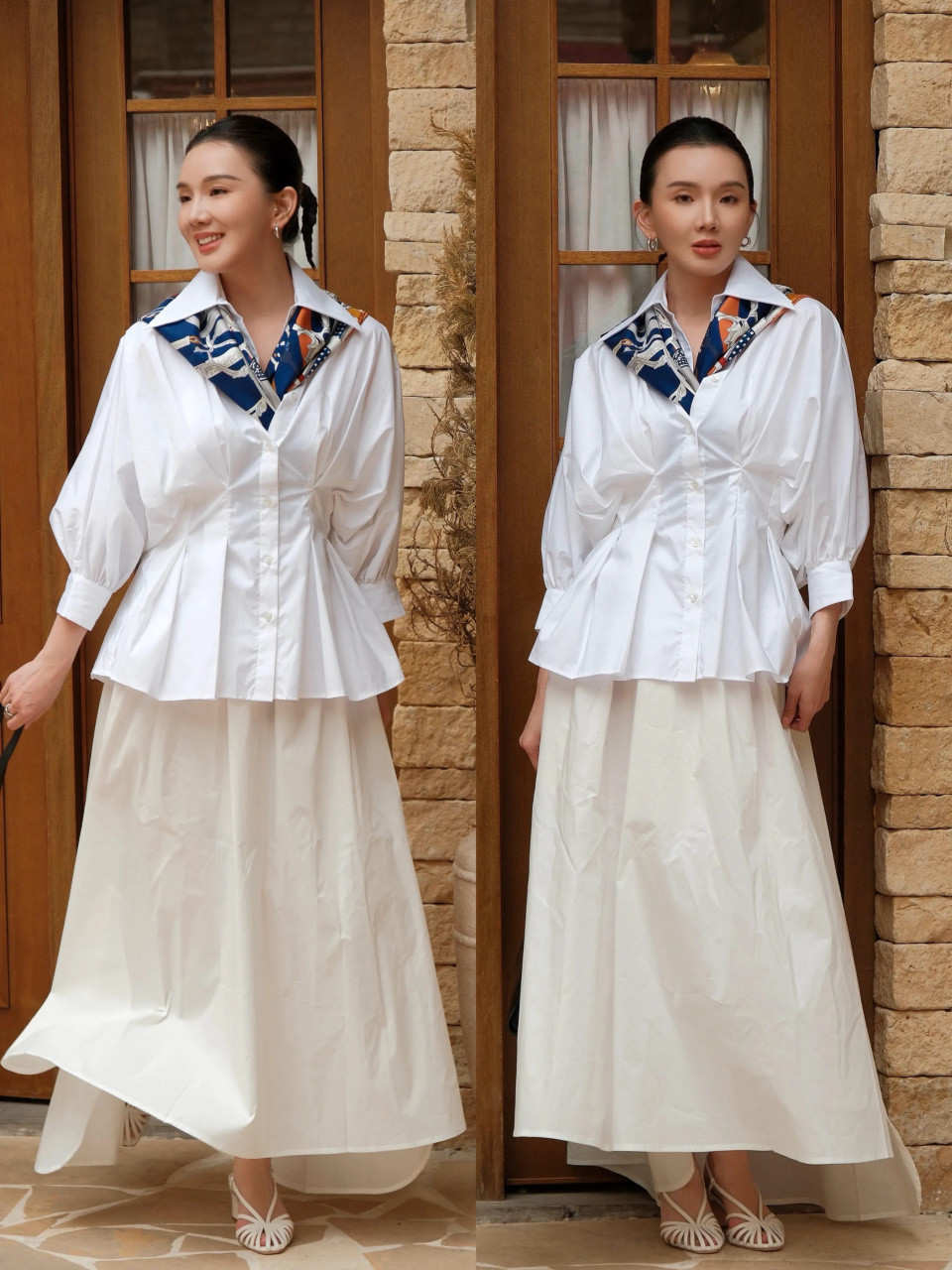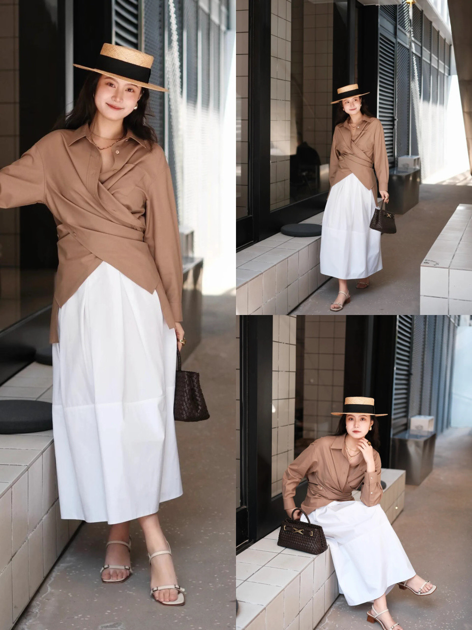 若是更偏爱日常的通勤穿搭风格,不妨可以选择一件小众的棕色衬衫上衣,配上白色的伞裙,脚踩一双低跟的凉鞋,这样的穿搭简简单单但又不失高级感,不张扬,不喧哗,照着穿就能让咱们变成时髦精。