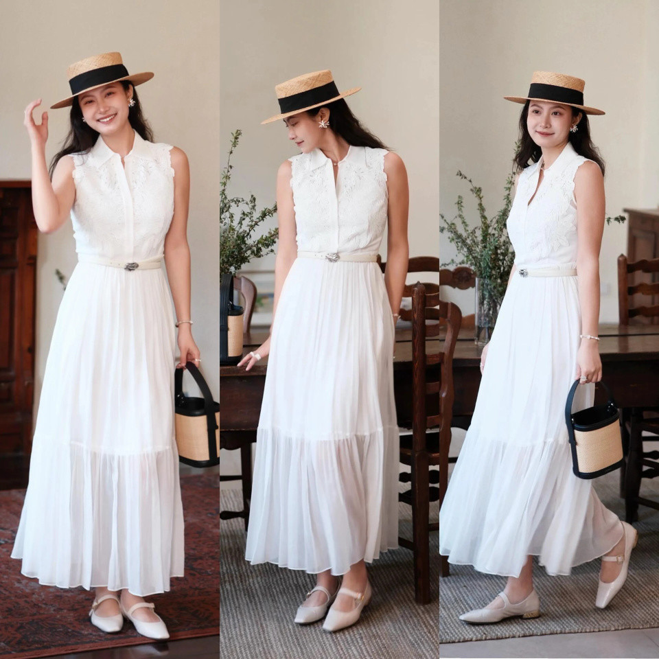可选一件白色的无袖衬衫连衣裙,配上一双白色的尖头浅口低跟单鞋,再戴上一顶草帽,氛围感直接拉满。这样的穿搭出门上班、逛街约会或者是旅游拍照都很出片。