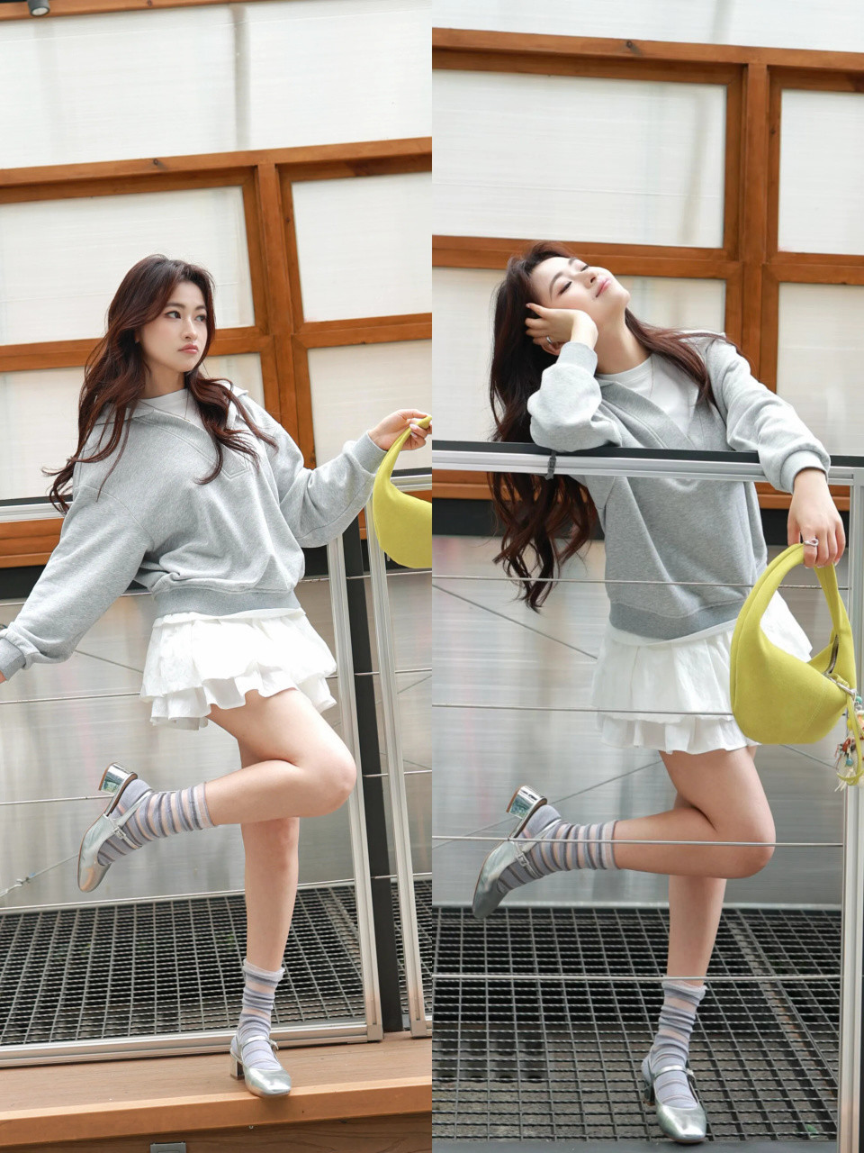 长相甜美的女生不妨选择一双粗跟的玛丽珍鞋,搭配上一条白色的压褶短裙和一件灰色的卫衣,这样的穿衣造型可盐可甜,少女感扑面而来。