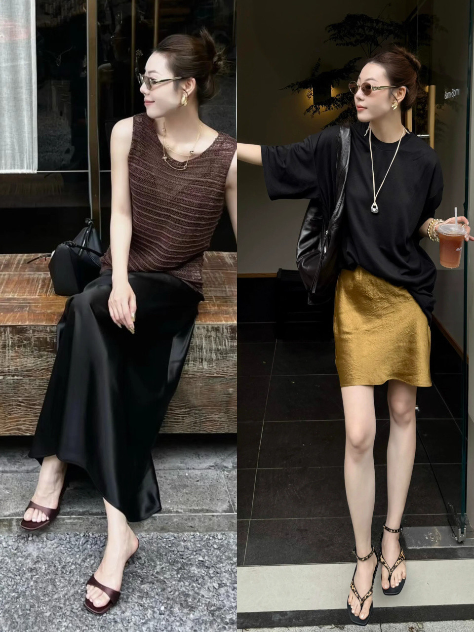 当然我们也可以选择一双银灰色的高跟凉鞋,配上白色的直筒半裙和 V 领的黑色无袖上衣,自带温柔优雅气质。