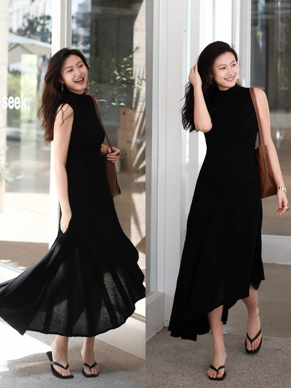 黑色的穿衣造型同样能穿出不一样的气质,例如用无袖的黑色连衣裙配上黑色的人字拖,适当的露出小腿肌肤,手臂线条感。穿在身上同样能轻松打破沉闷与枯燥。显得沉稳又时尚。